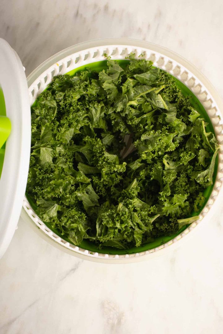 Step 3. Soak kale in warm tap water (110–115°F) for 10 minutes, swishing to remove grit. Spin dry in salad spinner.