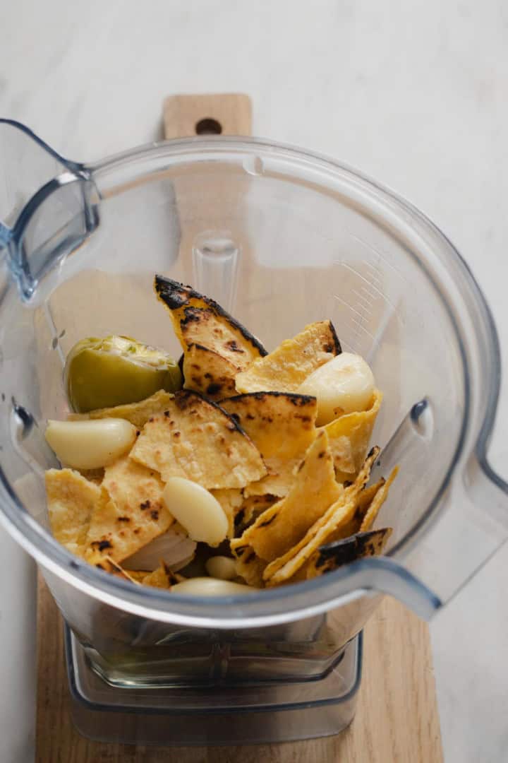 - Once the roasted garlic has cooled slightly, peel off the skins. In a blender, combine the charred tortilla, roasted tomatillos, tomatoes, onion, and garlic. Add one teaspoon of salt and one cup of chicken broth. Blend on high speed until completely smooth, , scraping down the sides as needed.