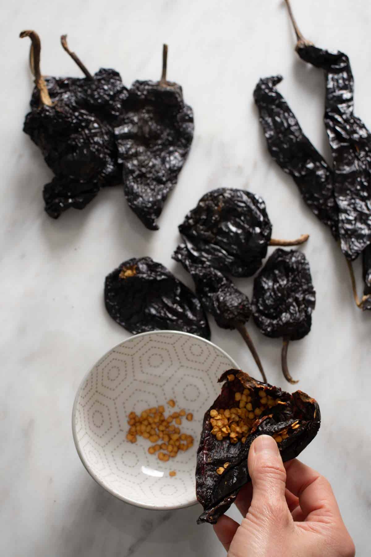 - Prepare the chiles by wiping them clean with a damp paper towel to remove any dust. Remove the stems and veins from the dried mulato, pasilla, and ancho chiles. Set the chile seeds aside in a small bowl for later use.