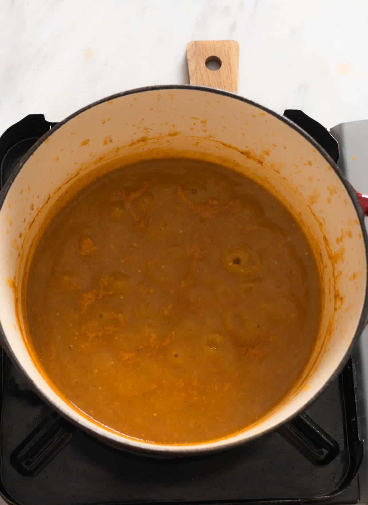 Step 8. Cook the Tomato Sauce - Heat oil in a medium pot over medium heat. Once the oil is warm, pour in the blended tomato sauce. Cook for 12–15 minutes, stirring occasionally, until the sauce thickens and darkens in color.